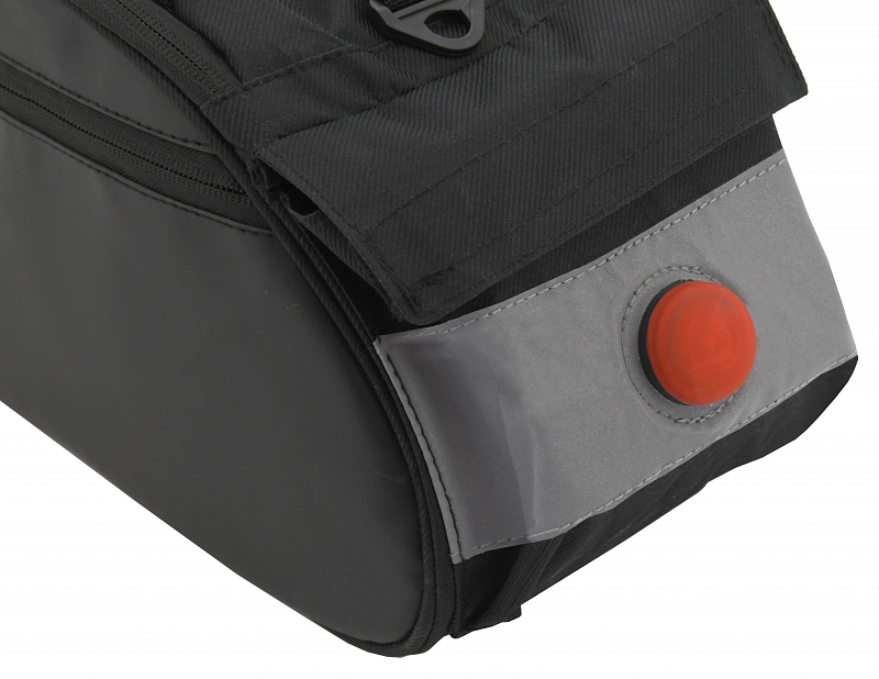 Materiál je odolný a snadno čistitelný, zadní část je doplněna o reflexní plochu a LED svícení, to zajistí Vaši bezpečnost za snížené viditelnosti. LED svítilnu lze zapnout jejím stisknutím, nabízí režim blikání a stálé svícení.