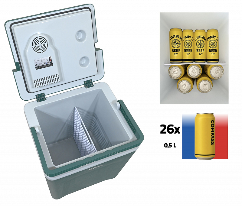 Box je napájen ze zásuvky autozapalovače 12V, nebo z běžné zásuvky 230V. Napájecí kabely jsou uložené v praktické uzavíratelné schránce přímo ve víku, takže jsou vždy při ruce a zároveň nikde nepřekáží.