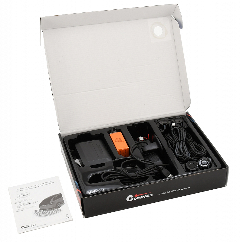 Balení obsahuje displej, řídící jednotku, 4 senzory pro montáž do zadního nárazníku, odpovídající kabeláž a vrták odpovídajícího průměru.