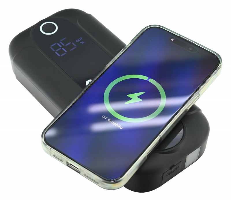Vrchní část zařízení je opatřena ploškou s magnetem, určenou pro 15W Qi bezdrátové nabíjení. Kromě toho je powerbanka vybavena dvěma USB výstupy. První podporuje rychlonabíjecí technologii Quick Charge, druhý poskytuje standardní výstup 5 V / 2 A. Díky tomu snadno nabijete smartphone, tablet či jiné zařízení.