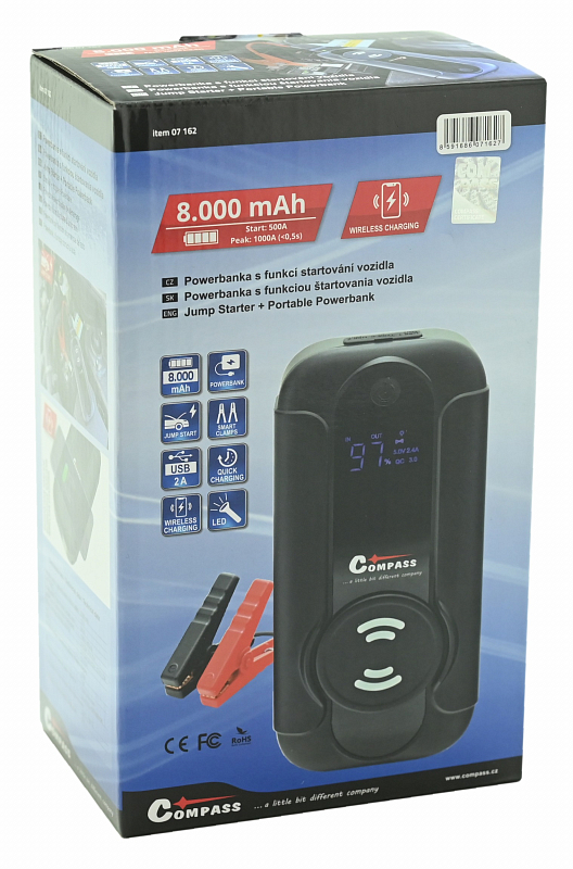 Powerbanka s kapacitou 8.000mAh s rychlým nabíjením USB, bezdrátovým Qi nabíjením a funkcí nouzového startování vozidla pomocí Smart klipsů.