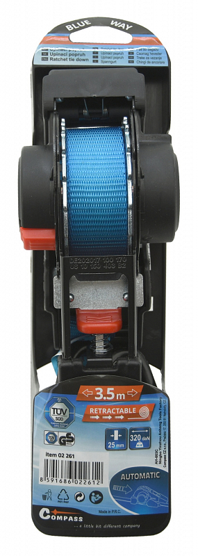 Samonavíjecí upínací popruh vysoké kvality s homologací TÜV/GS, k zajištění předmětů, zavazadel, nebo nákladu.