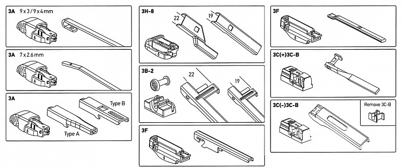 Balení zároveň obsahuje celou řadu adaptérů, díky kterým je možné stěrač použít na všechny běžná zakončení ramínek stěračů.
