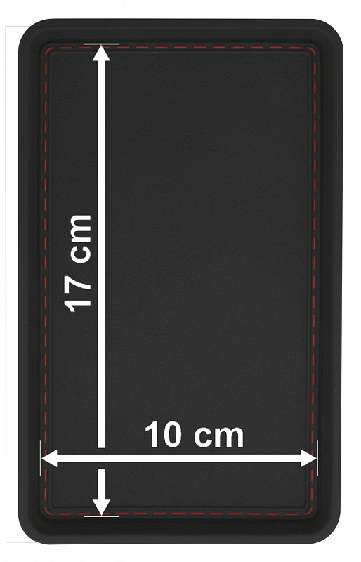 Podložka má rozměry 11 x 18 cm s výšku okraje 1 cm. Plocha pro umístění předmětů má rozměry 10 x 17 cm a zajišťuje umístěné předměty před samovolným sklouznutím.