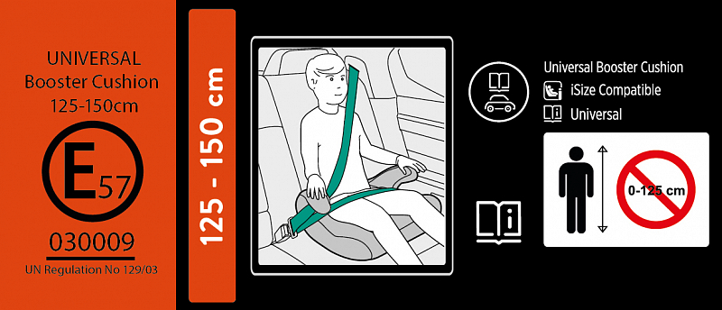 Podsedák, s novou homologací ECE R129 (kompatibilní s normou iSize). Podsedák je vhodný pro děti s výškou od 125 do 150 cm.