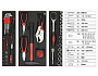 Sada obsahuje univerzální šroubovák včetně bitů, imbusové klíče s kulatým zakončením, kleště prodloužené, samosvorné i kombinované, gola sadu 1/2" včetně 14x nástavců, kladivo, svinovací metr (2 m) a další.
