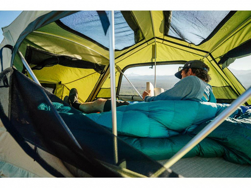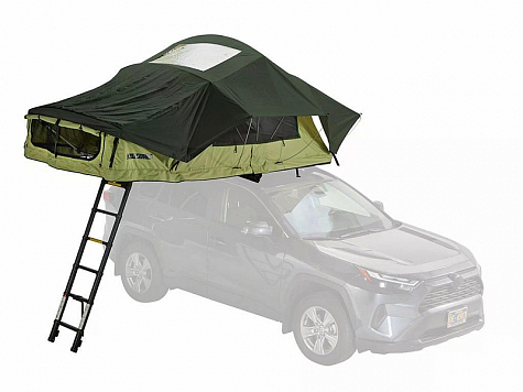 Rychle rozložitelný softshellový autostan Yakima SkyRise HD MD Green pro 2 osoby s prodlouženou přední částí pro krytý vstup po žebříku.